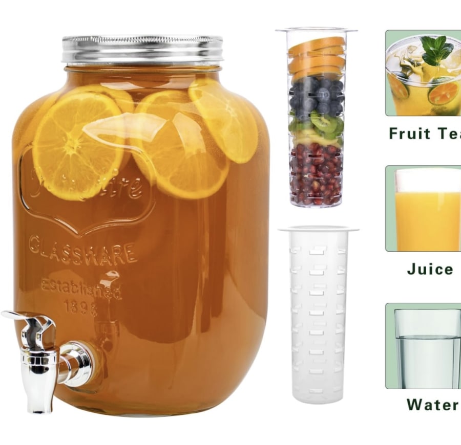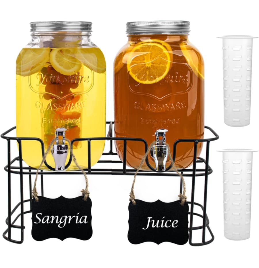 Enhance your next event with our double gallon glass drink dispensers with stand! 🥂 Perfect for serving a variety of beverages, these stylish dispensers come with two one-gallon jars, ideal for serving tea, lemonade, fruit water, or punch. With the included fruit diffuser, you can easily add a touch of flavor to your drinks.