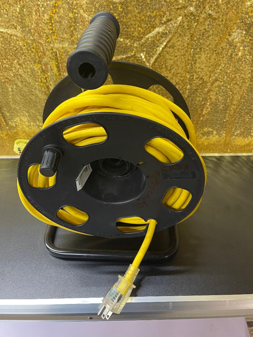 Looking for a reliable and durable extension cord to power your outdoor equipment or appliances? Look no further than our 100 Ft heavy duty yellow extension cord on a black reel. With its long length and sturdy construction, this extension cord is perfect for use in a variety of settings, whether it's for your backyard, construction site, or event venue.