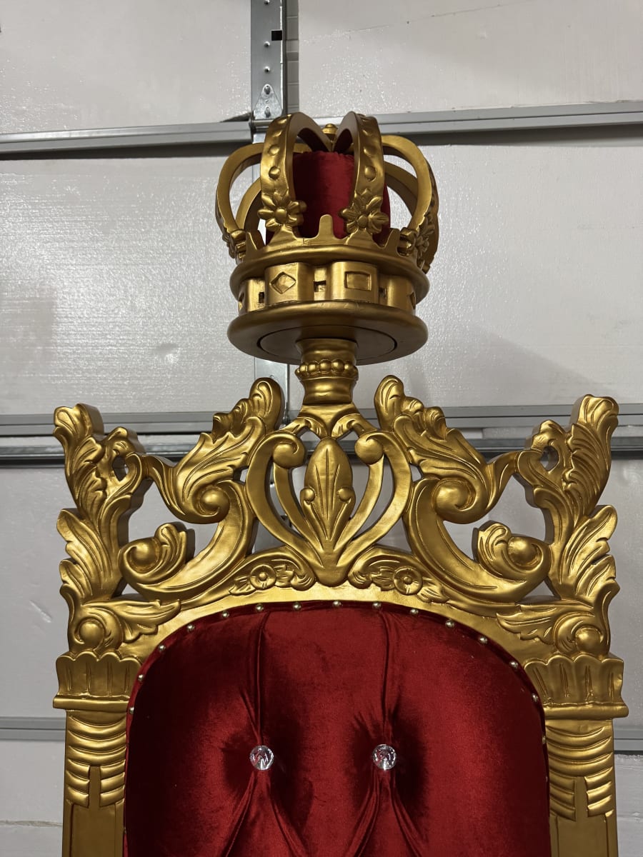 Standing at an impressive 7 ft 2 inches tall, the deluxe red throne chair with crown offers unmatched grandeur. The plush red velvet upholstery exudes elegance and comfort, while the meticulously carved gold trim and regal crown detail make this throne chair a true work of art. Whether you’re honoring a king, queen, or both, we have two chairs available to create a perfect royal setting for your celebration.